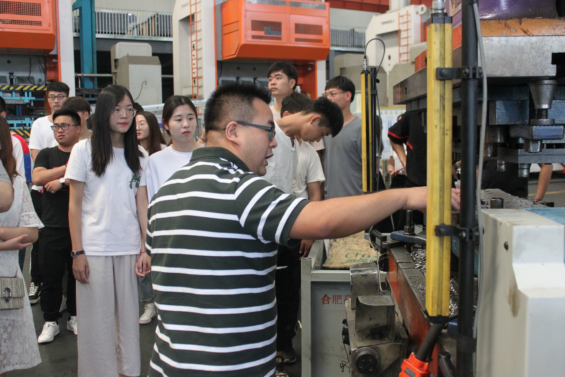 參觀的第二站:鈑金事業部,由事業部副部長田玉柱帶隊介紹。首先映入眼簾的是高大的、成套的、全機械自動化的流水線生產設備-機器人,這也讓同學們耳目一新,紛紛駐足觀看。隨后,田部長分別向他們介紹了大大小小的鈑金件,都說麻雀雖小,五臟俱全,再小的鈑金件,工序一樣不可小。鈑金的最后一站是京東方背板生產及噴粉線,這也是合肥高科近兩年來鈑金事業部的重頭戲、出彩戲。